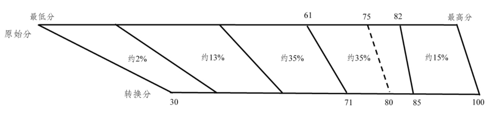 假设某考生思想政治科目合格性考试成绩达到合格,选择性考试科目原始分为75分。第一步,将该科目选择性考试原始分从高到低进行排序,按照规定的等级比例将该考生划定为B等级,该科目B等级的原始分分布区间为82~61(仅是示例,实际各科目各等级原始分分布区间丌固定);第二步,根据分数转换参数设置,将B等级内的该考生原始分,依照等比例转换法则,转换到85~71分数段,根据转换公式,该考生思想政治科目的转换分为: