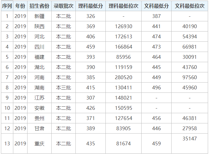截止2019年开设理学、工学、经济学、管理学、文学、法学6个学科门类,27个本科专业,其中电气工程及其自动化、土木工程等是学校的王牌专业。另外,下图是2019年新疆理工学院各省录取分数线及录取位次统计表: