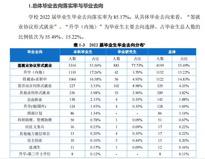 2021届各类毕业生共计9698人,毕业去向落实率为84.6%。其中博士研究生毕业55人,毕业去向落实55人,毕业去向落实率100%。硕士研究生毕业1240人,毕业去向落实1116人,毕业去向落实率90%。本科生毕业8403人,毕业去向落实7029人,毕业去向落实率83.6%,其中升学人数2281人,升学率27.1%。
