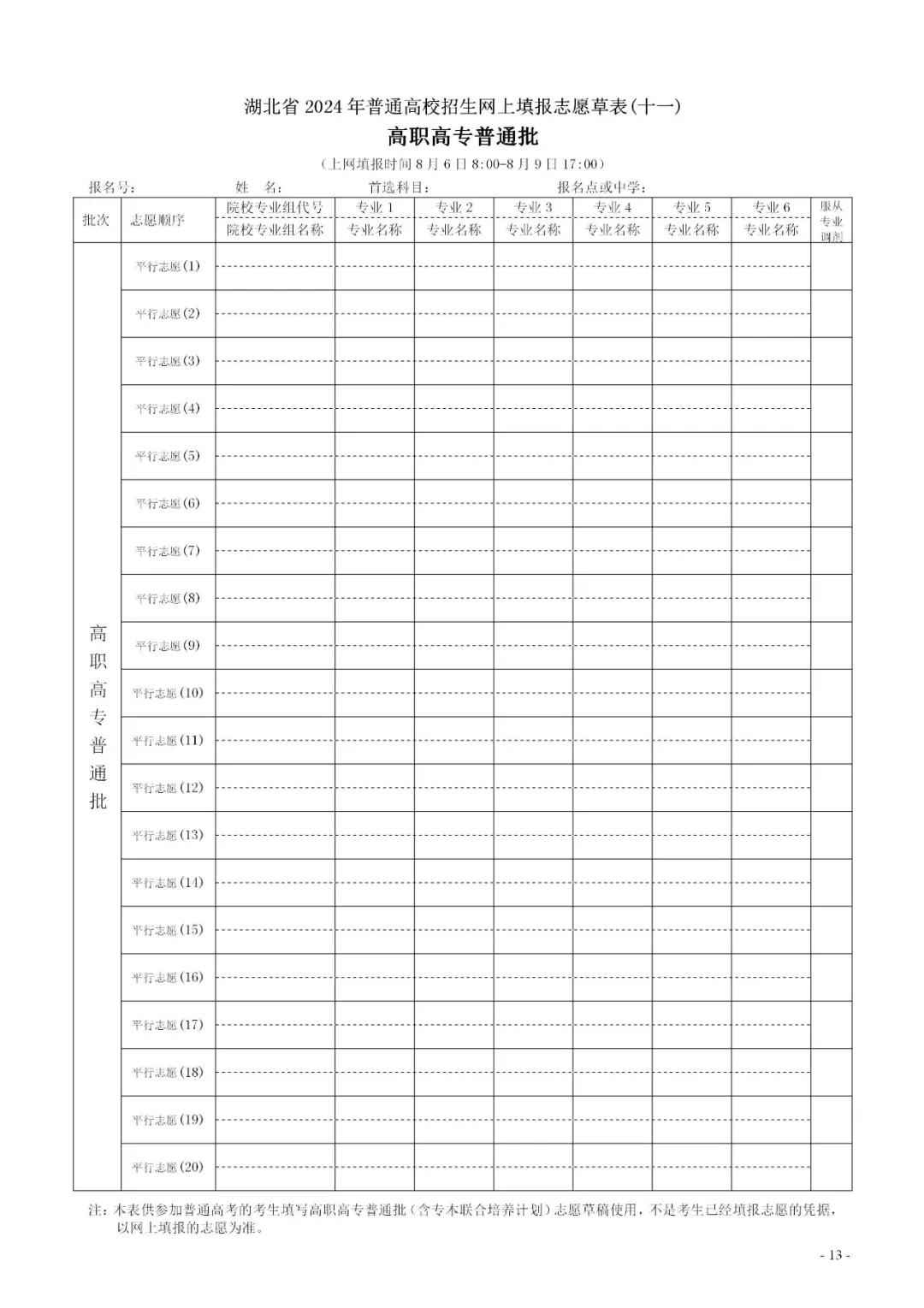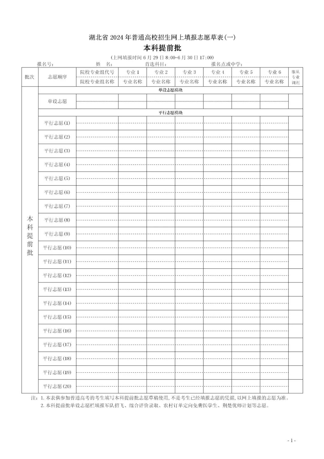 今年湖北省的志愿填报工作尚未开展,大家可以参考以下部分批次志愿填报样表,以下为2024年的湖北高考部分批次志愿预填表: